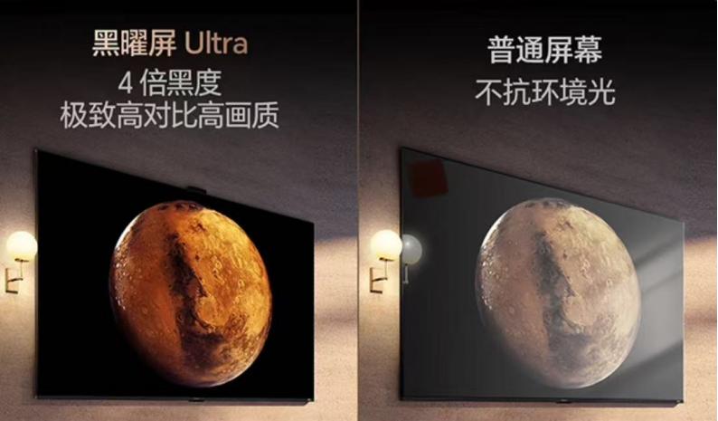 而另一個讓消費者煩惱的話題——屏幕反射,U8Q也提供了專門的解決方案——黑曜屏Ultra。通常消費者在選擇大屏電視的時候都會選擇低反屏,在這個基礎上,U8Q采用了雙層低反屏的方案。簡單解釋就是屏幕內外都使用了納米級LR低反技術,這個技術是海信獨家定制,能夠把反射率降低到1.28%,作為對比,普通電視屏幕的反射率大概在5.6%。