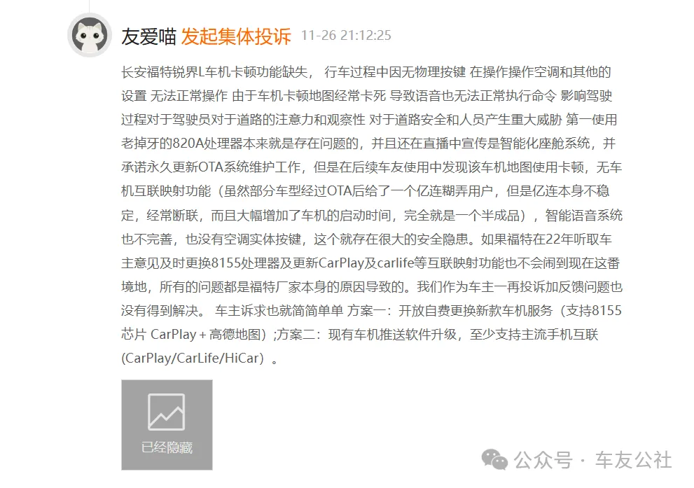 車主魏先生(化名)告訴車友公社,早在2022年,部分車主就已就處理器性能及互聯功能問題向廠家反饋。若當時長安福特能及時響應,更換性能更優的8155處理器并完善互聯功能,完全可以避免如今的維權風波。