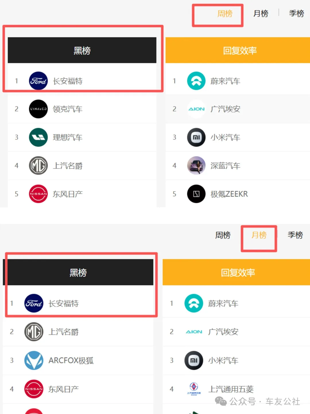 隨著長安福特車主對于此集中問題的投訴維權,長安福特在黑貓等投訴平臺的投訴量激增。在黑貓投訴平臺上最新的汽車投訴周榜和月榜中,長安福特均為黑榜第一。