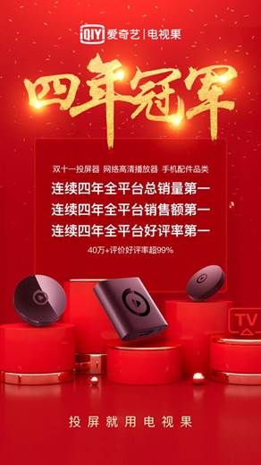 2019年,愛奇藝電視果的第4個雙十一狂歡,第4次奪得投屏器、網絡高清播放器、手機配件品類全平臺銷量、銷售額、好評率三料冠軍。愛奇藝電視果連續四年領跑投屏賽道和家庭新觀影方式,引領AI投屏觀影新風尚。