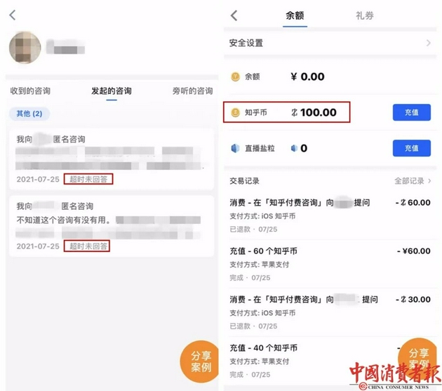 今年7月25日,他在知乎平臺上分別充值60元和40元購買付費服務――請兩位“答主”回答自己的問題。48小時后,答主均超時未回答。沒想到,這100元“變”成100個知乎幣。