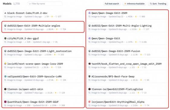 Qwen-Image系列模型自開(kāi)源發(fā)布以來(lái),即刻成為全球AI社區(qū)最火熱的開(kāi)源視覺(jué)基礎(chǔ)模型,當(dāng)前總下載量已突破300萬(wàn)次。在全球最大的AI開(kāi)源社區(qū)HuggingFace的“圖生圖”榜單前15中,有13個(gè)都是Qwen-Image的原生或衍生模型,網(wǎng)友們紛紛基于Qwen-Image魔改出各種新版本等,比如鏡頭控制lora效果,可實(shí)現(xiàn)圖片的多角度重新編輯,目前仍高居HuggingFace的演示空間(Space)榜單第一。如今,開(kāi)源社區(qū)的優(yōu)秀創(chuàng)意也已吸納到新改版的Qwen-Image-Edit模型中,基模上就可實(shí)現(xiàn)打光、換視角等特色效果。
