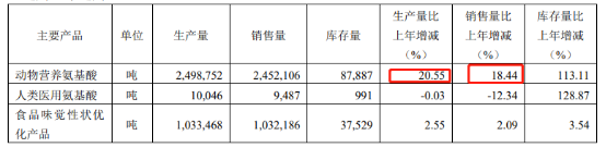 除了整體毛利率的增長外,公司營業凈利潤的增長還跟公司產銷兩旺有關。報告期內,公司去年全年動物營養氨基酸產量達到249.88萬噸,同比增加20.55%;銷量達到245.21萬噸,同比增長18.44%。