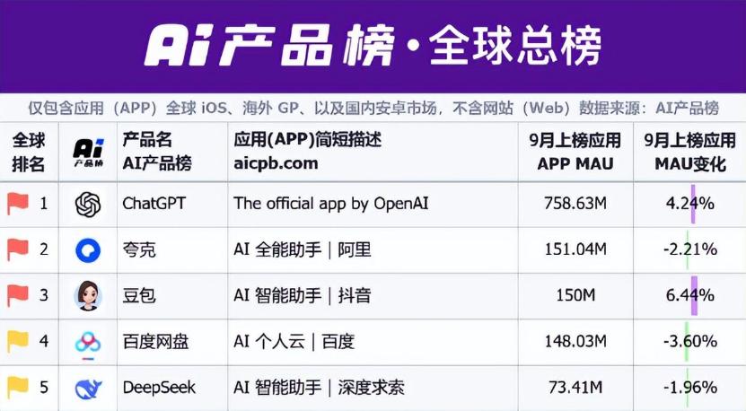 相較之下,夸克則是阿里更好的選擇,其本身已經(jīng)擁有億級規(guī)模的用戶群體。AI產(chǎn)品榜數(shù)據(jù)顯示,今年9月,夸克的月活躍用戶規(guī)模僅次于ChatGPT,豆包緊隨其后。