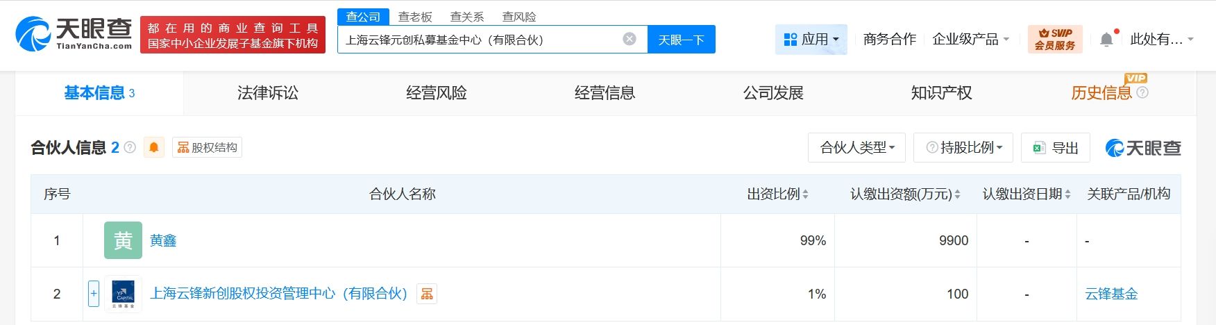 天眼查工商信息顯示,近日,上海云鋒元創私募基金中心(有限合伙)成立,執行事務合伙人為上海云鋒新創股權投資管理中心(有限合伙),出資額1億人民幣,經營范圍為以私募基金從事股權投資、投資管理、資產管理等活動。