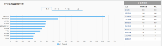 東財Choice數據顯示,近一個月來,行業機構調研排行榜中,計算機軟件行業以超1500次的來訪量位列第一,領先排名第二的電子設備制造行業近一倍。