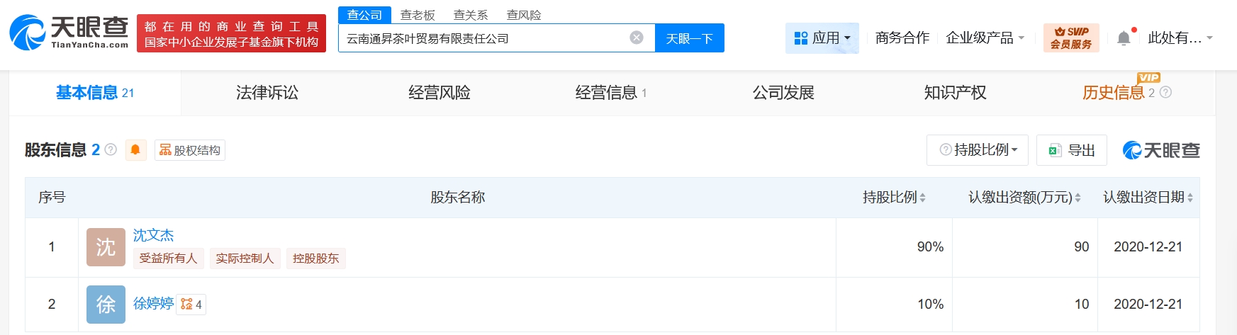 天眼查工商信息顯示,云南通昇茶葉貿易有限責任公司成立于2020年12月,法定代表人為徐慶梅,注冊資本100萬人民幣,經營范圍含酒、飲料及茶葉的銷售,茶葉包裝設計等。股東信息顯示,該公司由沈文杰、徐婷婷分別持股90%、10%。值得一提的是,2024年年報信息顯示,該公司職工基本醫療保險參保人數為5人,生育保險、工傷保險、城鎮職工基本養老保險、失業保險參保人數均為0。