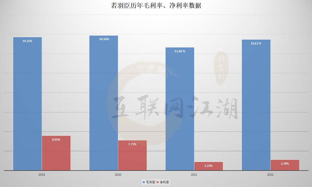 可以發(fā)現(xiàn),若羽臣近兩年?duì)I收處于增長態(tài)勢,只在去年出現(xiàn)略微下降。但凈利潤和扣非凈利潤卻在2021年經(jīng)歷了一次巨變,分別同比下滑了近67.01%、76.20%。所幸的是,若羽臣在2022年止住了下跌態(tài)勢,不過3178.1萬的利潤數(shù)據(jù)相比2020年的8106.96萬仍然差距較大。