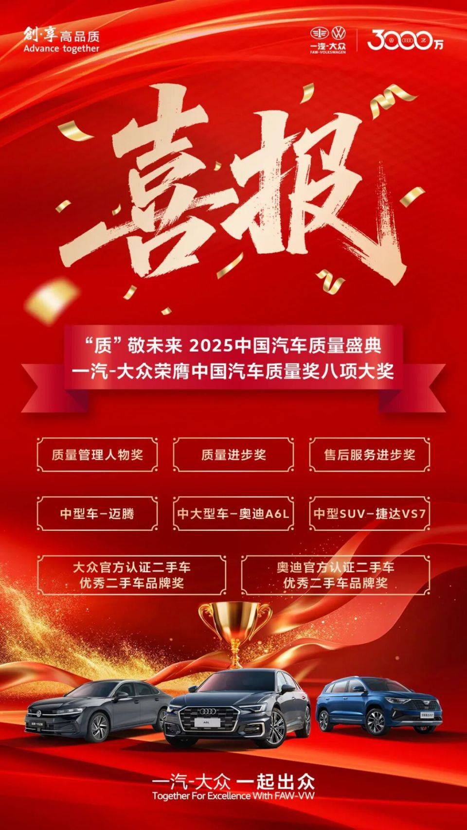 一汽-大眾體系力持續(xù)收獲國家級和行業(yè)級權(quán)威認證,夯實品牌信任根基。11月20日,“‘質(zhì)’敬未來 2025中國汽車質(zhì)量盛典”在廣州舉行,一汽-大眾一舉斬獲八項重磅大獎,全方位印證全生命周期質(zhì)量管理實力。