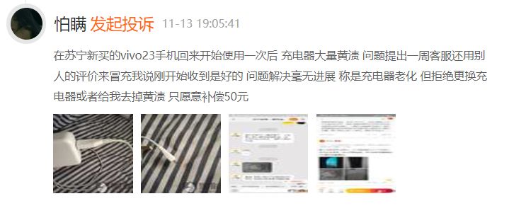 還有的消費(fèi)者購(gòu)買vivo新手機(jī)使用一次后,充電器就出現(xiàn)大量黃漬。而在這位消費(fèi)者提出問(wèn)題后,被客服各種推諉,問(wèn)題始終沒(méi)有得到解決。