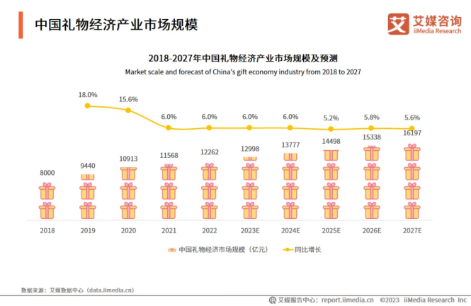 根據(jù)艾媒咨詢數(shù)據(jù),2018-2022年中國(guó)禮物經(jīng)濟(jì)產(chǎn)業(yè)市場(chǎng)規(guī)模從8000億元增至12262億元,預(yù)計(jì)2027年中國(guó)禮物經(jīng)濟(jì)市場(chǎng)規(guī)模將達(dá)16197億元。