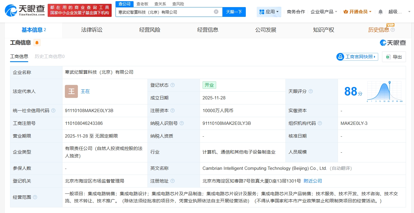 天眼查App顯示,近日,寒武紀智算科技(北京)有限公司成立,法定代表人為王在,注冊資本1億人民幣,經(jīng)營范圍包括集成電路設(shè)計、集成電路芯片及產(chǎn)品制造、集成電路芯片設(shè)計及服務等。