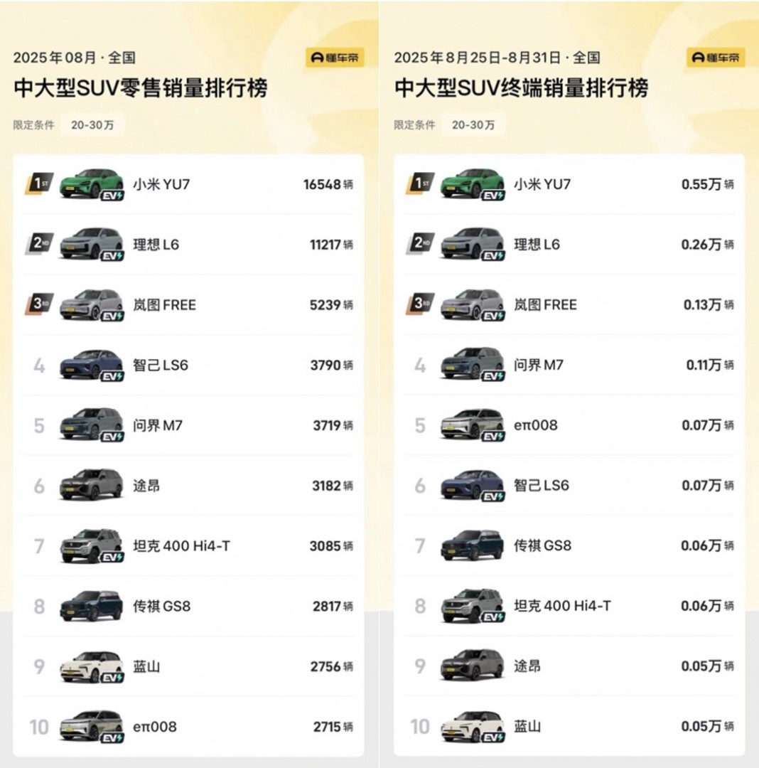 【TechWeb】9月9日消息,2025年8月20-30萬元中大型SUV銷量成績單出爐:嵐圖FREE+以 5,239輛 的月銷成績,強勢躋身細分市場Top3;排名前兩位的分別是小米YU7和理想L6。
