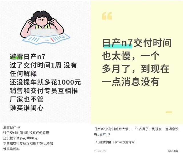 新車交付不及時,消費者的耐心沒了,就從粉絲變成“黑粉”。在小紅書等社交平臺,許多消費者陸續(xù)反映N7未及時交付車輛的問題,提到車的車主,也吐槽車身質量、操作系統(tǒng)各種問題。N7采用Momenta一段式端到端飛輪大模型,支持L2級智駕系統(tǒng)。但從社交媒體上用戶的反饋來看,在識別和決策邏輯上,日產N7還有較大的提升空間。