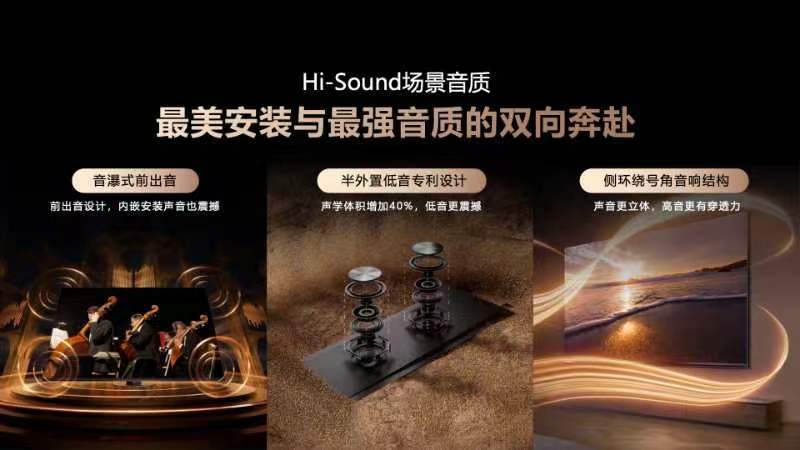 針對日益增長的掛裝需求,海信電視E8系列升級10mm薄型壁掛,配合超薄一體化機身和0.8mm金屬窄邊框設(shè)計,帶來更具融入感和品質(zhì)感的視覺享受。正面出音的主聲道音瀑設(shè)計,可感受到聲浪的撲面而來。同時,雙側(cè)發(fā)聲環(huán)繞音響系統(tǒng),在左右兩側(cè)分別配備了出音單元,通過環(huán)繞號角,聲場擴寬一倍,增加包圍感。半外置低音的專利設(shè)計增加了40%的聲學(xué)體積,超潛低音,表現(xiàn)更自然、更震撼、更具力量感。
