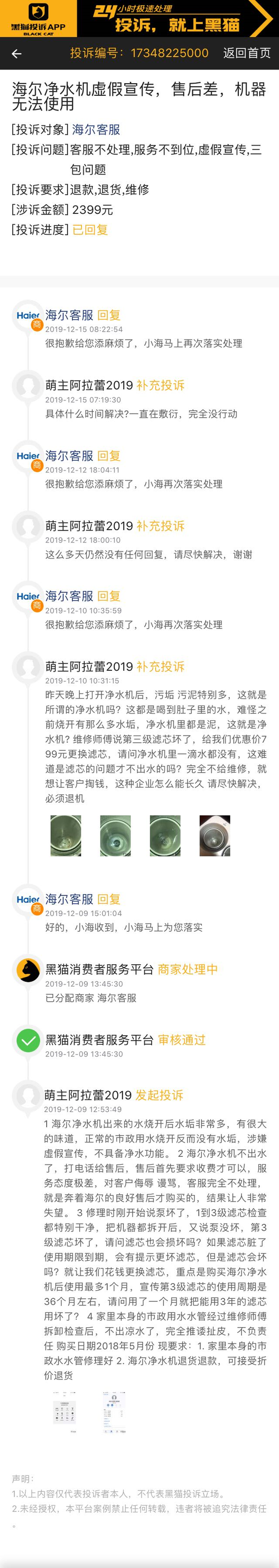 12月4日,一網友在黑貓投訴江蘇站投訴稱:1 海爾凈水機出來的水燒開后水垢非常多,有很大的味道,正常的市政用水燒開反而沒有水垢,涉嫌虛假宣傳,不具備凈水功能。 2 海爾凈水機不出水了,打電話給售后,售后首先要求收費才可以,服務態度極差,對客戶侮辱 謾罵,客服完全不處理,就是奔著海爾的良好售后才購買的,結果讓人非常失望。 3 修理時剛開始說泵壞了,1到3級濾芯檢查都特別干凈,把機器都拆開后,又說泵沒壞,第3級濾芯壞了,請問濾芯也會損壞嗎?如果濾芯臟了使用期限到期,會有提示更壞濾芯,但是濾芯會壞嗎?就讓我們花錢更換濾芯,重點是購買海爾凈水機后使用最多1個月,宣傳第3級濾芯的使用周期是36個月左右,請問用了一個月就把能用3年的濾芯用壞了? 4 家里本身的市政用水水管經過維修師傅拆卸檢查后,不出涼水了,完全推諉扯皮,不負責任 購買日期2018年5月份 現要求:1. 家里本身的市政水水管修理好 2. 海爾凈水機退貨退款,可接受折價退貨。